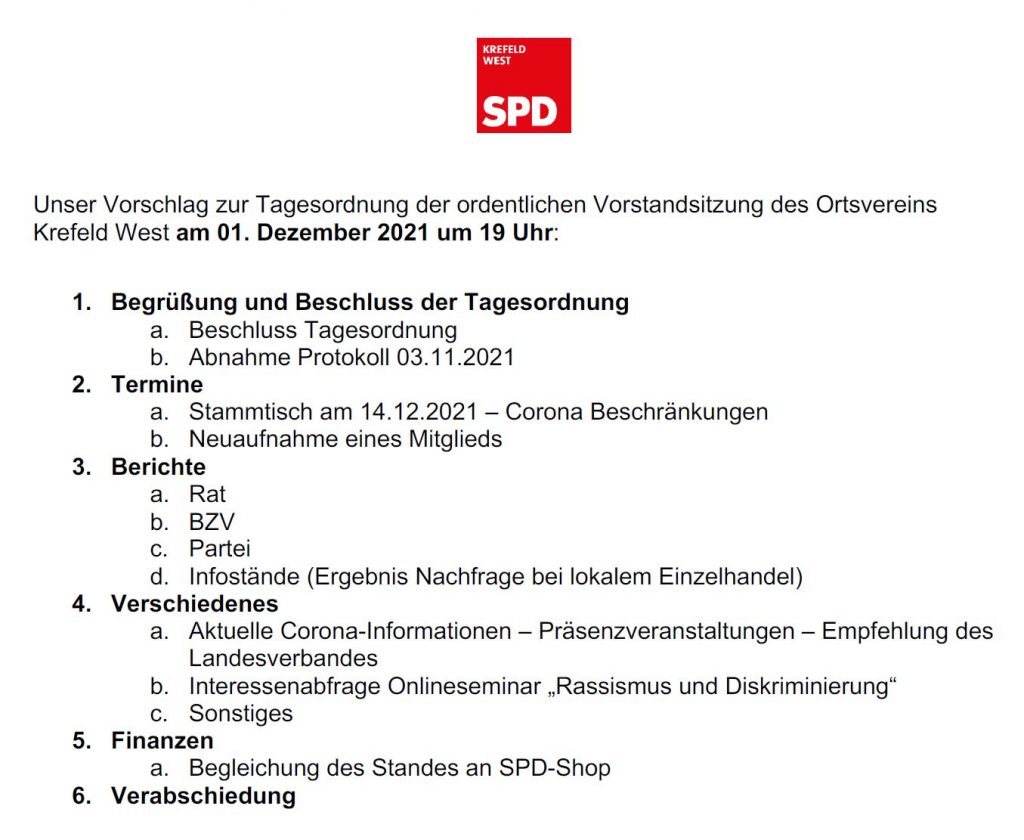 Am Mittwoch, 01. Dezember 2021 findet die ordenliche Sitzung des Ortsvereinsvorstandes SPD Krefeld West statt. Die Sitzung findet online statt.